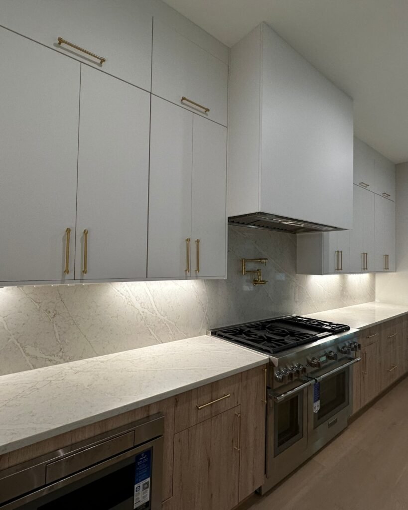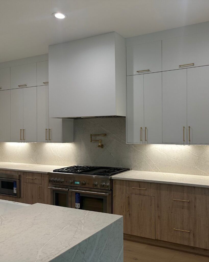 Plywood boxes (more stable than particleboard) High-gloss acrylic doors (scratch-resistant) Wood veneers (authentic look without warping) GG Kitchen & Bath uses formaldehyde-free materials with UV-resistant finishes.