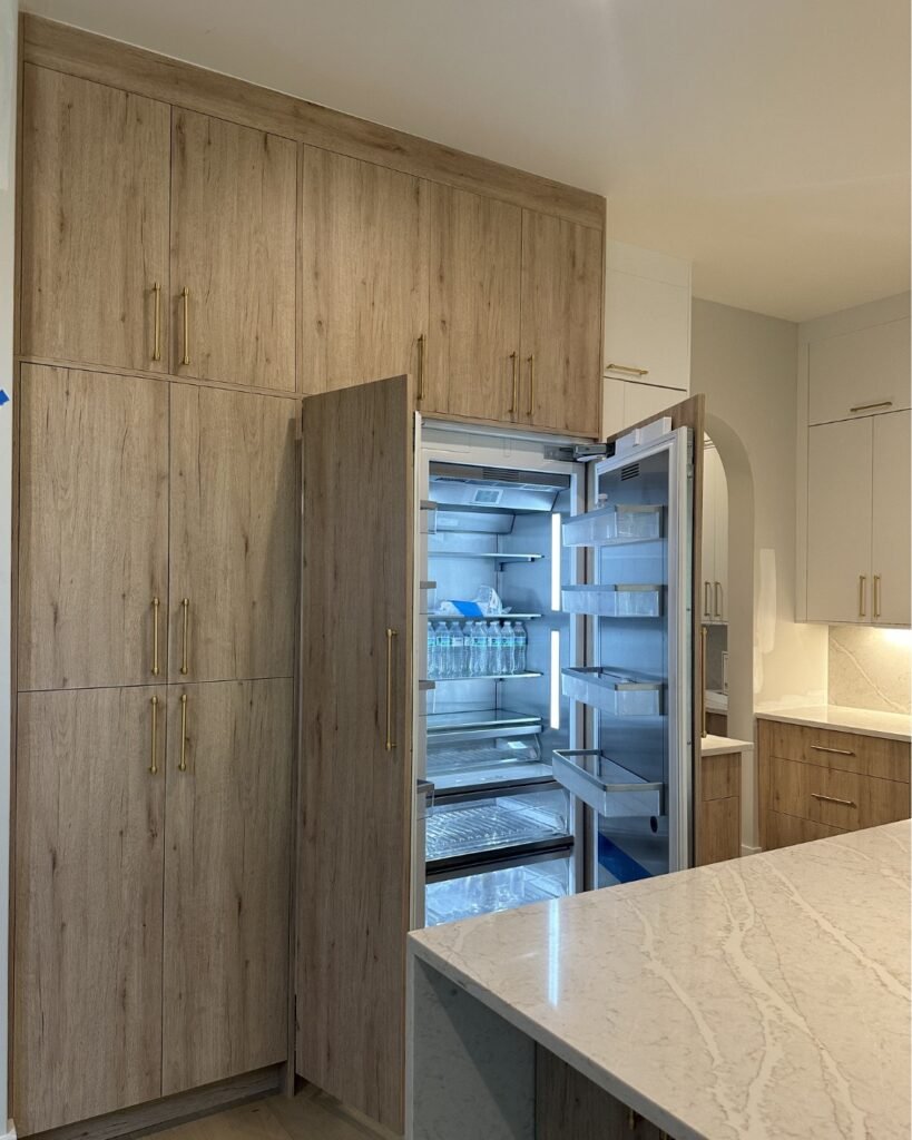 Frameless cabinets, or full-access cabinetry, eliminate the face frame found in traditional designs. Instead, the cabinet box is constructed from thicker panels (typically ¾” to 1” thick), with doors and drawers mounted directly to the box for a seamless, ultra-modern look.